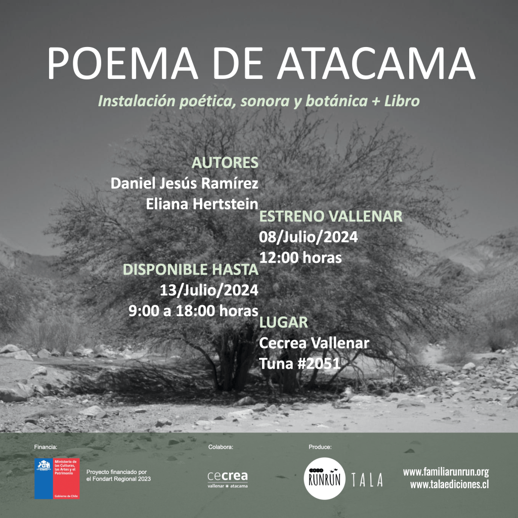 Durante el mes de julio, el Cecrea de Vallenar y el Centro Cultural Atacama, en Copiapó, albergarán la obra “Poema de Atacama”, trabajo compuesto por una instalación multidisciplinaria más un libro del artista sonoro y escritor Daniel Jesús Ramírez y la poeta Eliana Hertstein, integrantes de nuestro colectivo, que propone un ejercicio creativo que cruza el lenguaje del ensayo, la poesía, el arte sonoro y la botánica.