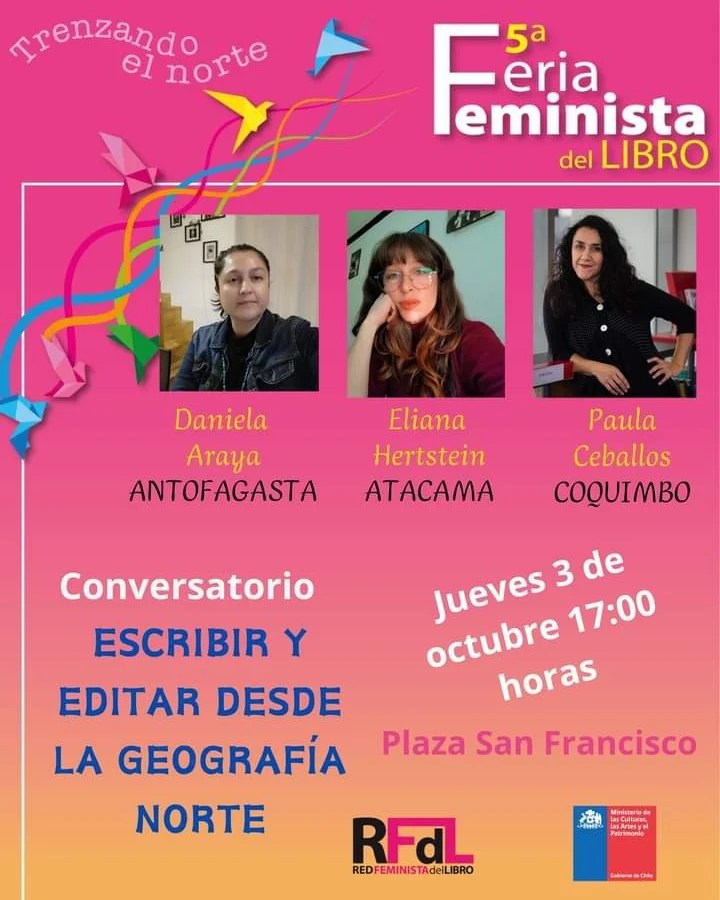 Hoy y mañana participaremos de la 5ª Feria Feminista del Libro, organizada por la Red Feminista del Libro de Coquimbo. A su vez, entre el 4 y el 6 del mismo mes, diremos presente en la 13ª Primavera del Libro, organizada por el gremio Editoriales de Chile. Esta última se desarrollará por primera vez en el Parque Estadio Nacional, en la comuna de Ñuñoa. La instancia contará con la participación de cerca de 200 editoriales del país.